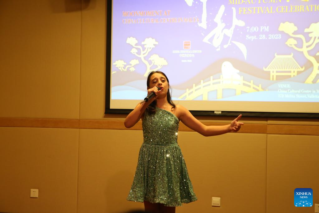 A girl sings a Chinese song during a celebration of the Chinese Mid-Autumn Festival in Valletta, Malta, on Sept, 28, 2023. The China Cultural Center in Malta on Thursday evening hosted a vibrant celebration of the Chinese Mid-Autumn Festival, showcasing a delightful array of activities, including music, mooncake making and tasting, lantern crafting, and calligraphy. (Xinhua/Chen Wenxian)