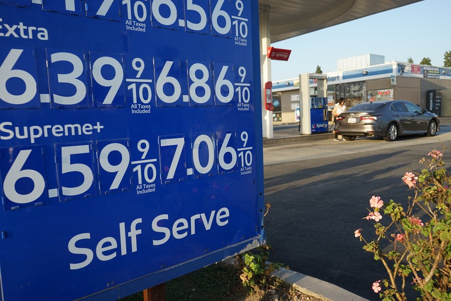 Gas prices are displayed at a gas station in El Monte, Los Angeles County, California, the United States, on Sept. 28, 2023. (Photo by Zeng Hui/Xinhua)