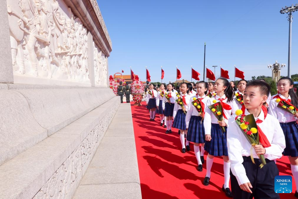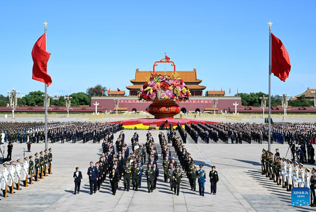 A ceremony presenting flower baskets to fallen national heroes to mark the Martyrs' Day is held in Tian'anmen Square in Beijing, capital of China, Sept. 30, 2023. (Xinhua/Rao Aimin)