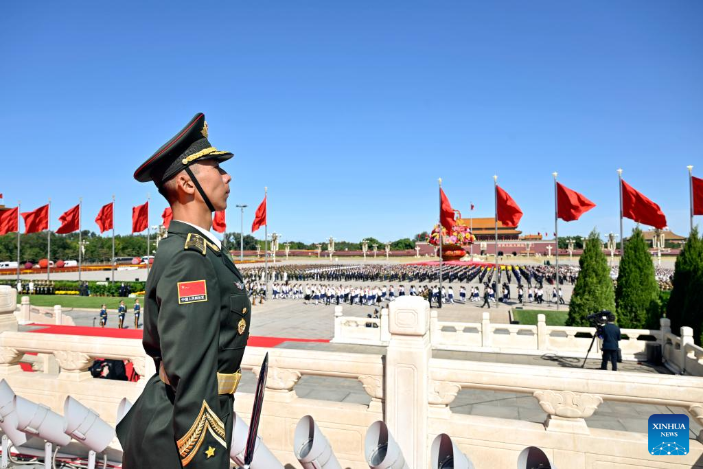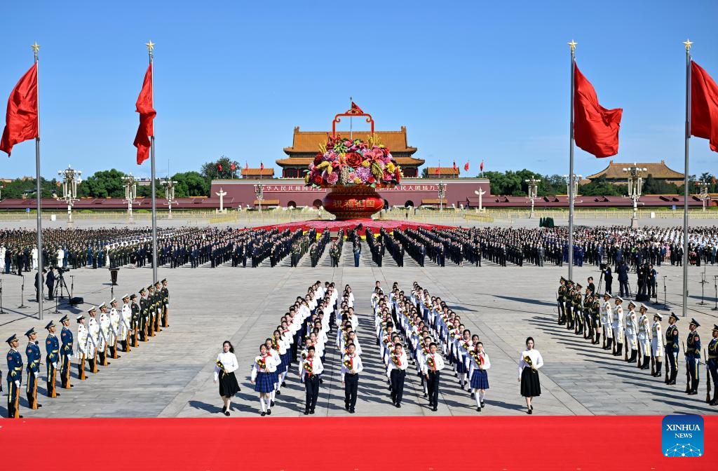 A ceremony presenting flower baskets to fallen national heroes to mark the Martyrs' Day is held in Tian'anmen Square in Beijing, capital of China, Sept. 30, 2023. (Xinhua/Zhai Jianlan)