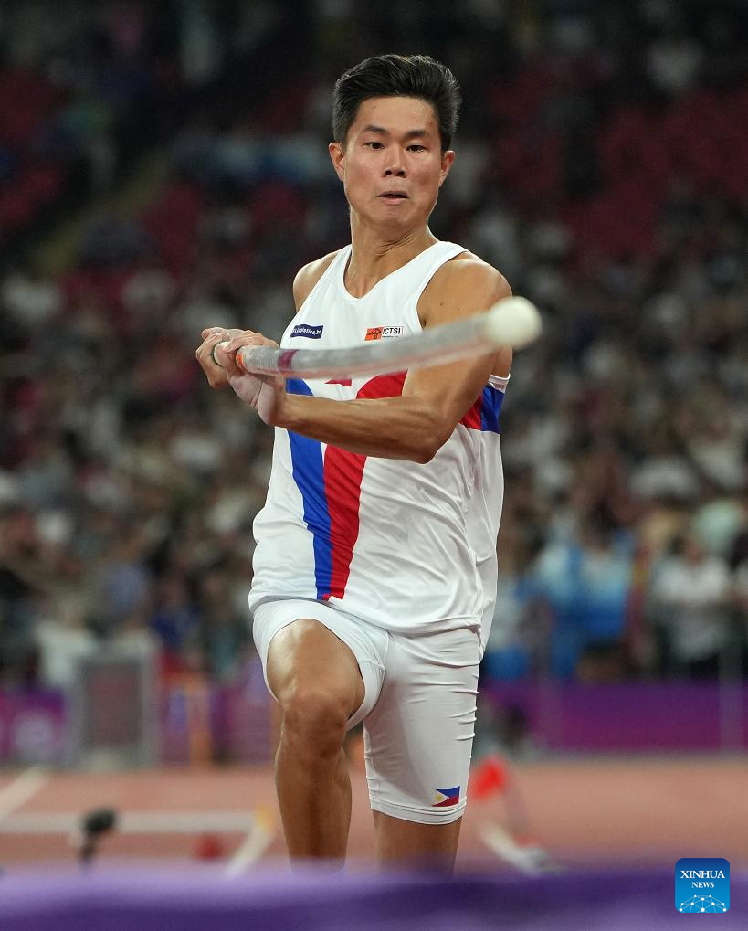 Ernest John Obiena of the Philippines competes during the Men's Pole Vault of Athletics at the 19th Asian Games in Hangzhou, east China's Zhejiang Province, Sept. 30, 2023. (Xinhua/Li Yibo)