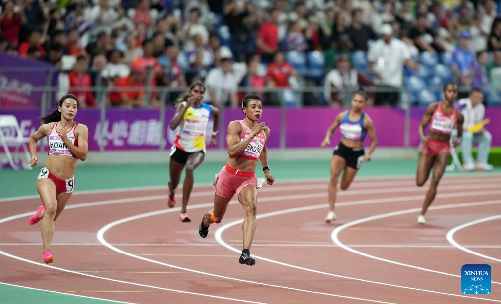 Oluwakemi Mujidat Adekoya(1st R) of Bahrain competes during the Women's 400m Final of Athletics at the 19th Asian Games in Hangzhou, east China's Zhejiang Province, Sept. 30, 2023. (Xinhua/Sun Fei)