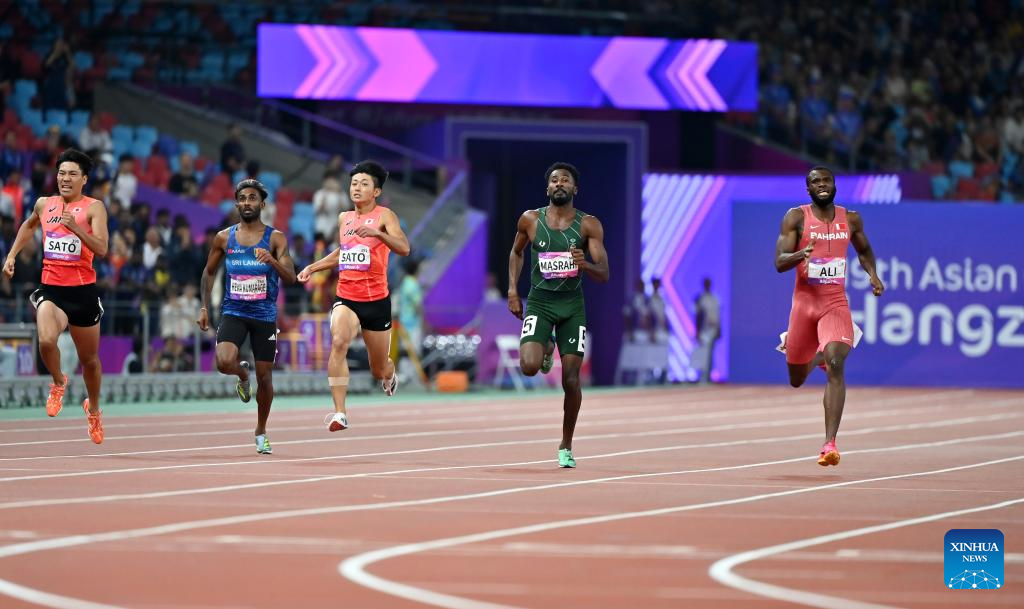 Athletes compete during the Men's 100m Semifinal of Athletics at the 19th Asian Games in Hangzhou, east China's Zhejiang Province, Sept. 30, 2023. (Xinhua/Sun Fei)