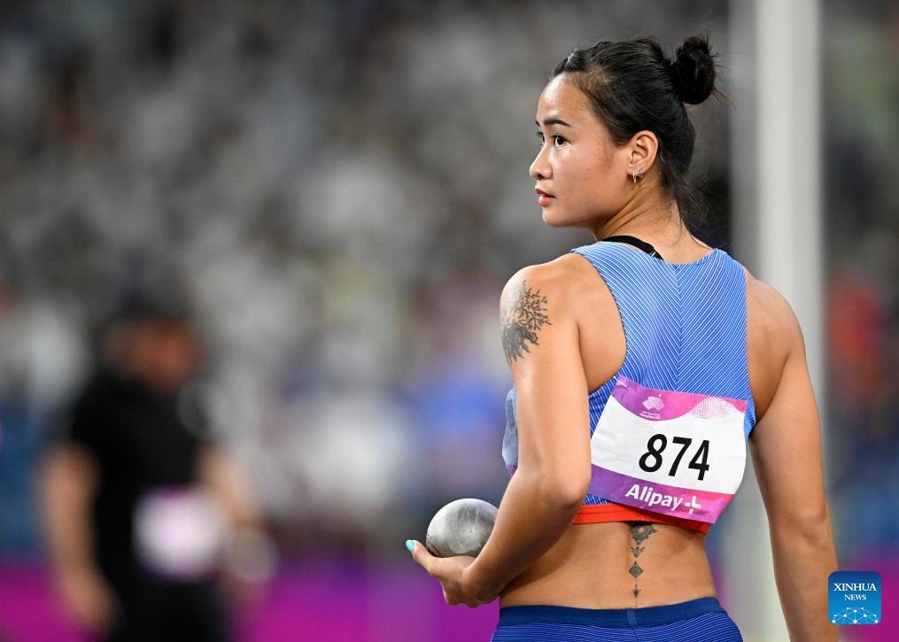 Chen Cai-Juan of Chinese Taipei reacts during the Women's Heptathlon Shot Put of Athletics at the 19th Asian Games in Hangzhou, east China's Zhejiang Province, Sept. 30, 2023. (Xinhua/Song Yanhua)