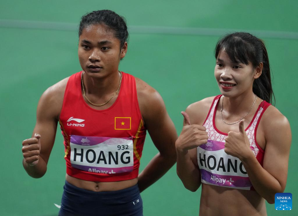 Hoang Thi Anh Thuc(L) of Vietnam and Hoang Thi Minh Hanh of Vietnam react after the Women's 400m Final of Athletics at the 19th Asian Games in Hangzhou, east China's Zhejiang Province, Sept. 30, 2023. (Xinhua/Jiang Wenyao)