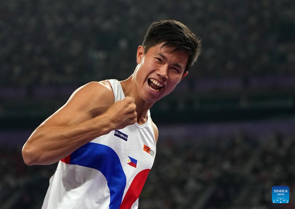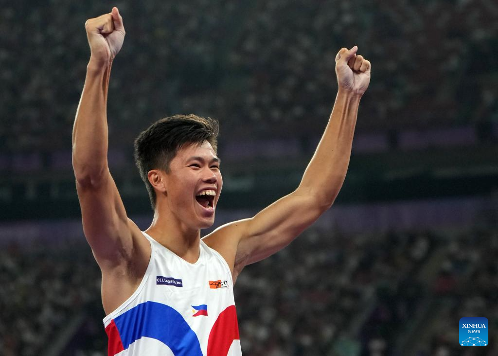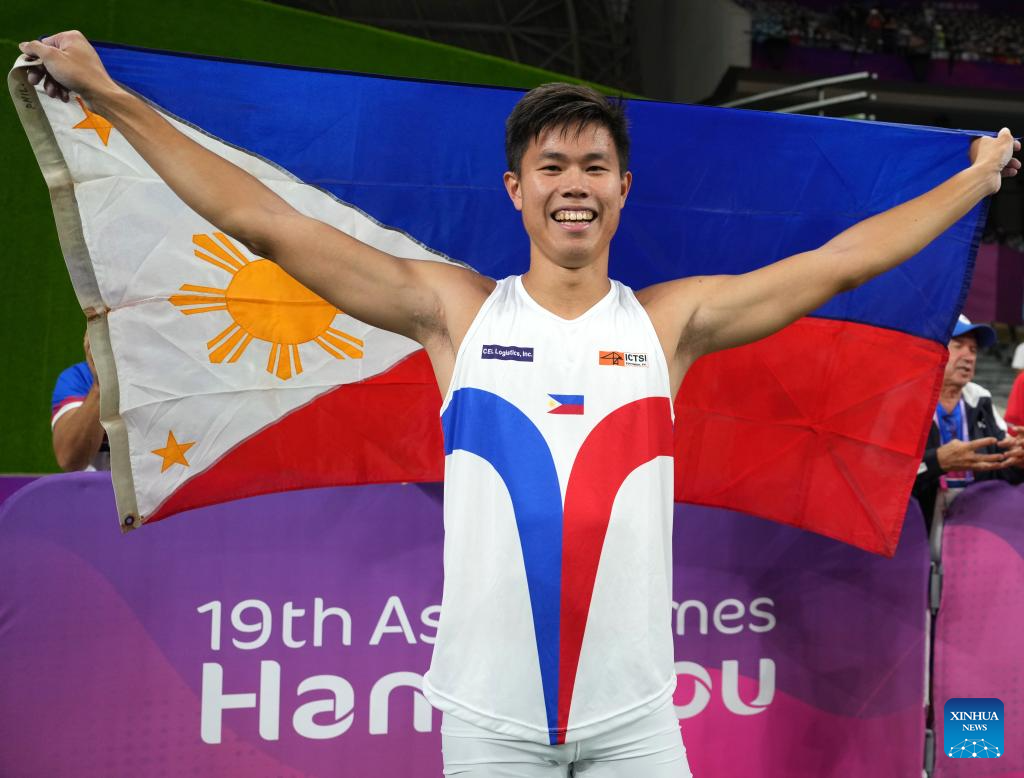 Ernest John Obiena of the Philippines celebrates after the Men's Pole Vault of Athletics at the 19th Asian Games in Hangzhou, east China's Zhejiang Province, Sept. 30, 2023. (Xinhua/Li Yibo)