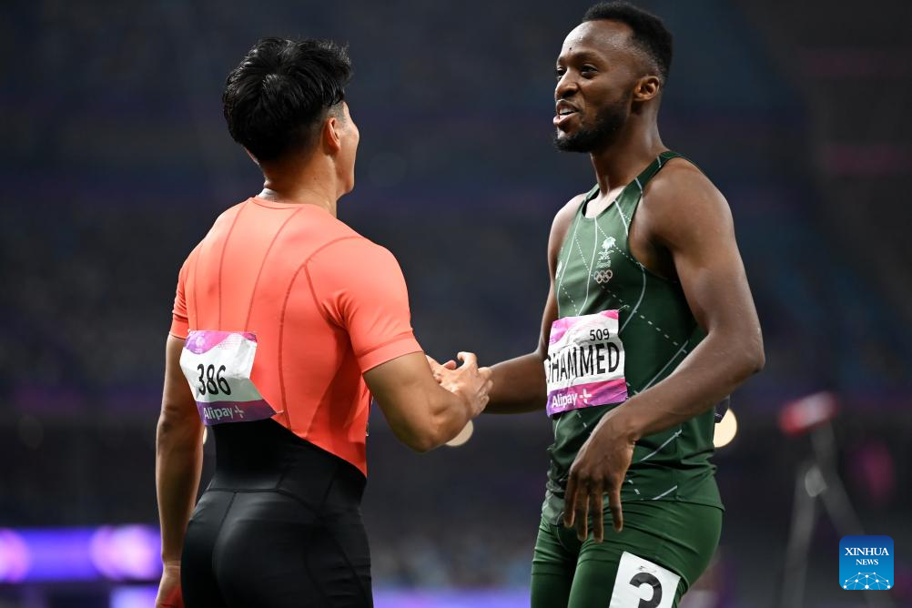 Abdullah Abkar Mohammed (R) of Saudi Arabia greets Koike Yuki of Japan after the Men's 100m Semifinal of Athletics at the 19th Asian Games in Hangzhou, east China's Zhejiang Province, Sept. 30, 2023. (Xinhua/Jiang Han)