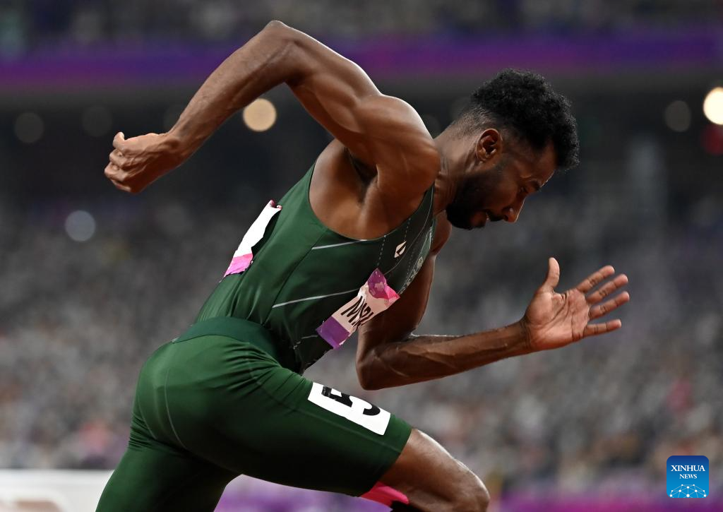 Yousef Ahmed M Masrahi of Saudi Arabia reacts after the Men's 400m Final of Athletics at the 19th Asian Games in Hangzhou, east China's Zhejiang Province, Sept. 30, 2023. (Xinhua/Song Yanhua)