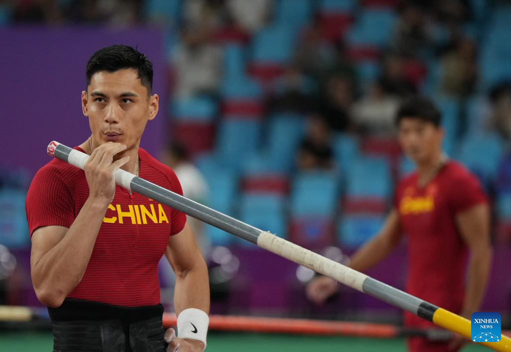 Huang Bokai of China competes during the Men's Pole Vault of Athletics at the 19th Asian Games in Hangzhou, east China's Zhejiang Province, Sept. 30, 2023. (Xinhua/Li Yibo)