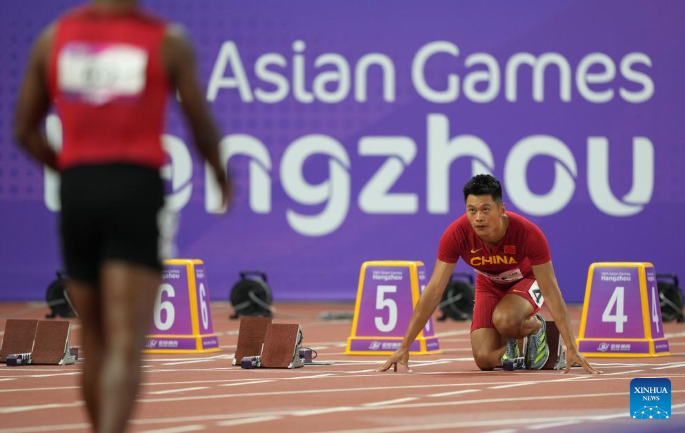 Xie Zhenye of China reacts before the Men's 100m Semifinal of Athletics at the 19th Asian Games in Hangzhou, east China's Zhejiang Province, Sept. 30, 2023. (Xinhua/Li Yibo)