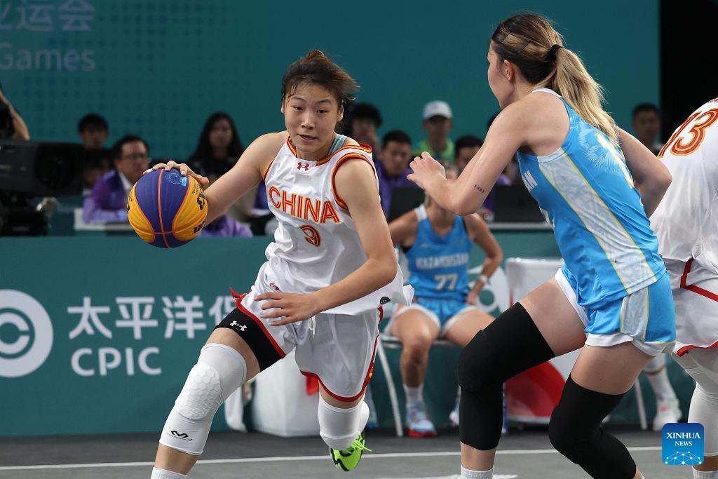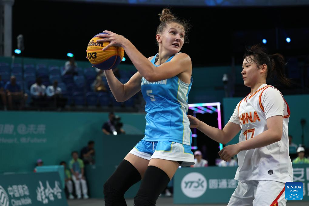 Wang Xinyu (L) of China competes during Women's U23 Quarterfinal of 3X3 Basketball between Kazakhstan and China at the 19th Asian Games in Huzhou, east China's Zhejiang Province, Sept. 30, 2023. (Xinhua/Chen Bin)