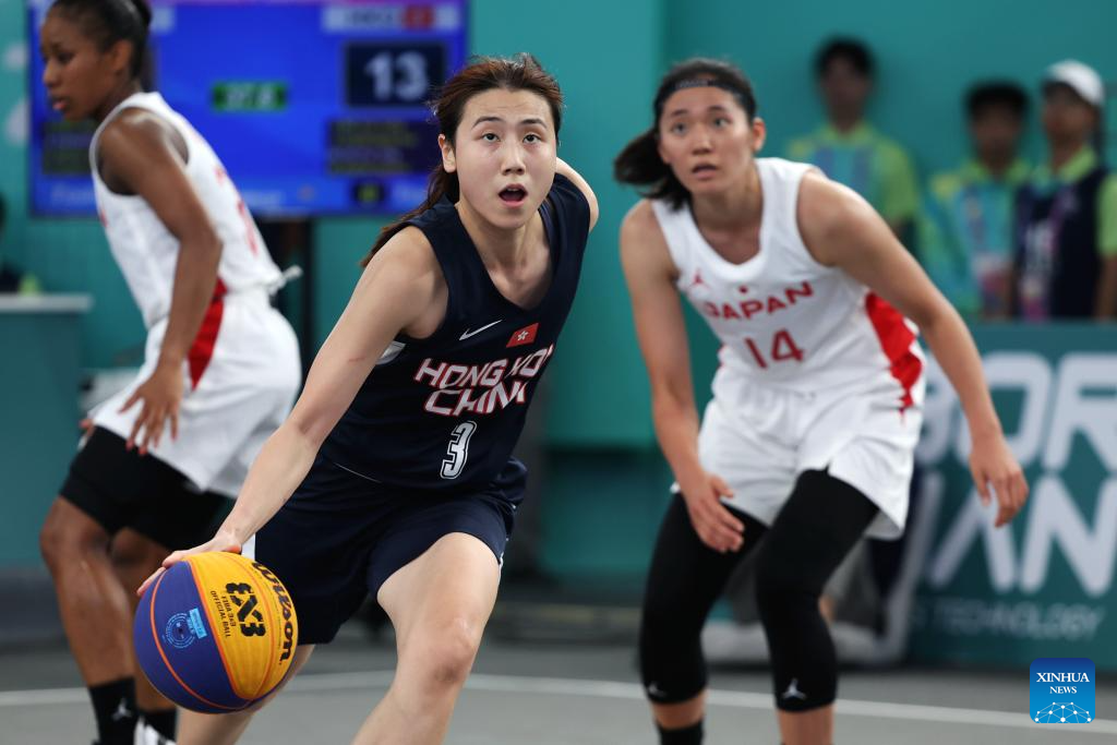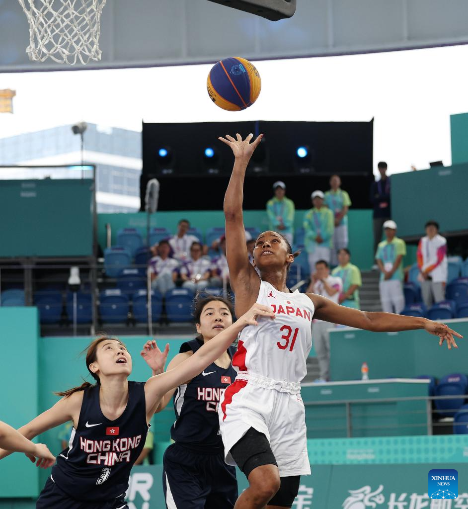 Chan Wing Yan (1st R) of China's Hong Kong competes during Women's U23 Qualifications to Quarterfinal of 3X3 Basketball between Japan and China's Hong kong at the 19th Asian Games in Huzhou, east China's Zhejiang Province, Sept. 30, 2023. (Xinhua/Chen Bin)