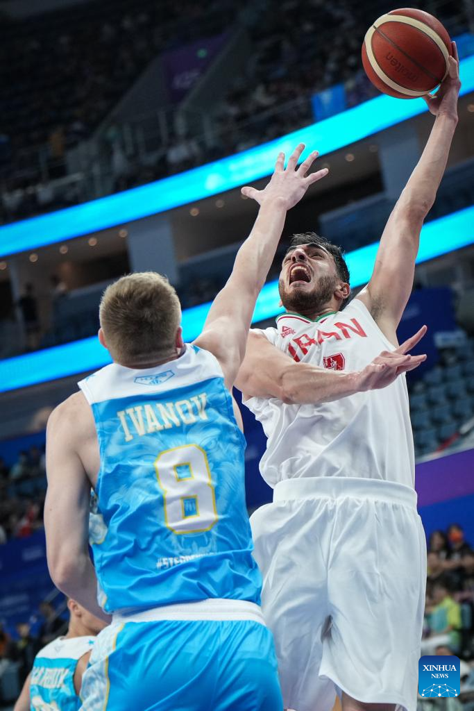 Arsalan Kazemi Naeini (2nd R) of Iran competes during the Men's Preliminary Round Group match of Basketball between Iran and Kazakhstan at the 19th Asian Games in Hangzhou, east China's Zhejiang Province, Sept. 30, 2023. (Xinhua/Pan Yulong)