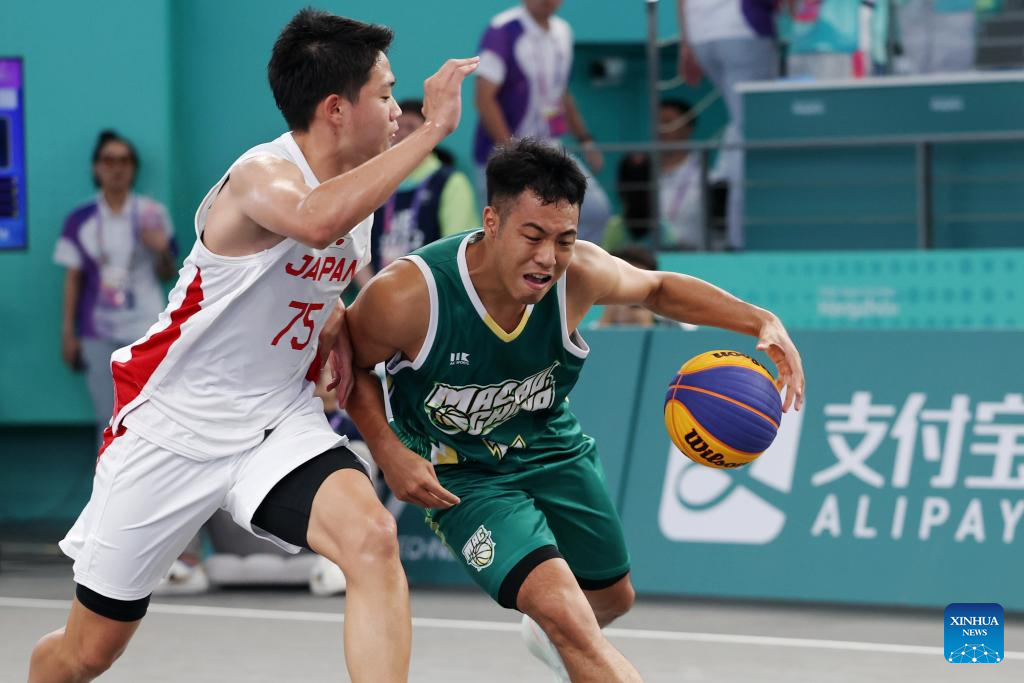 Ho Hou In of China's Macao competes during Men's Qualifications to Quarterfinal of 3X3 Basketball between Japan and China's Macao at the 19th Asian Games in Huzhou, east China's Zhejiang Province, Sept. 30, 2023. (Xinhua/Chen Bin)