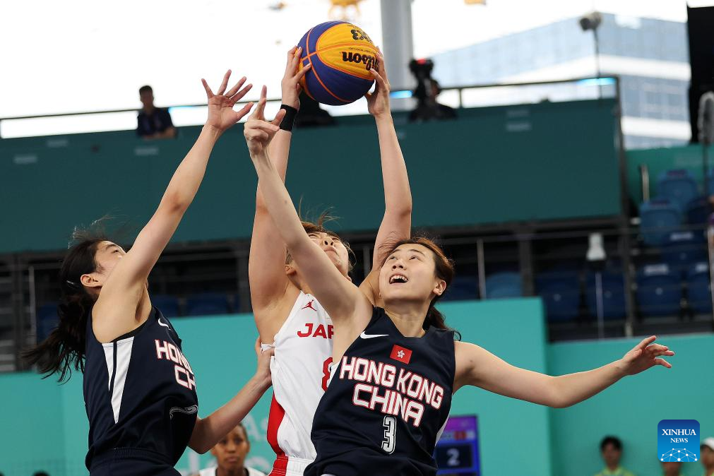 Chan Wing Yan (C) of China's Hong Kong competes during Women's U23 Qualifications to Quarterfinal of 3X3 Basketball between Japan and China's Hong kong at the 19th Asian Games in Huzhou, east China's Zhejiang Province, Sept. 30, 2023. (Xinhua/Chen Bin)