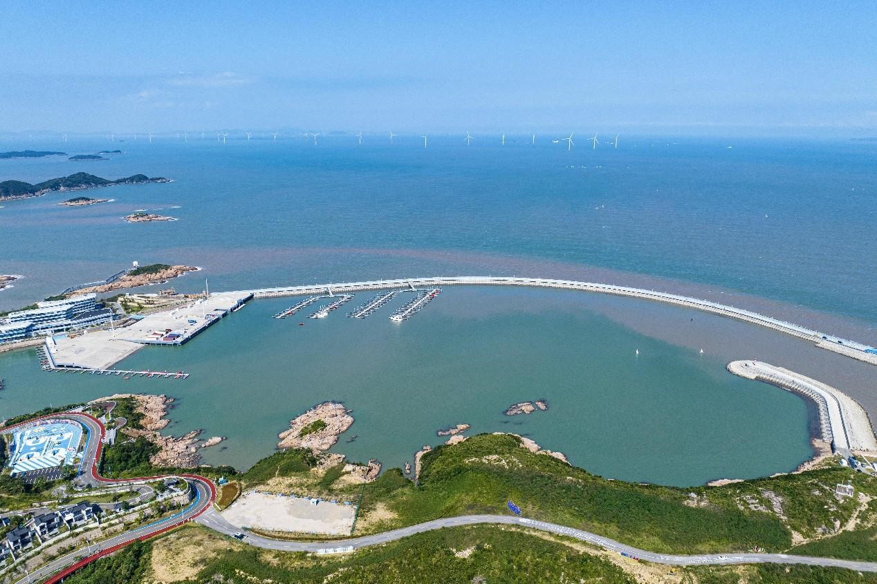 The Ningbo Xiangshan Sailing Center, Ningbo, east China's Zhejiang province forms a beautiful green landscape with the Tuci offshore wind farm. (Photo by Zheng Kaixia/People's Daily Online)