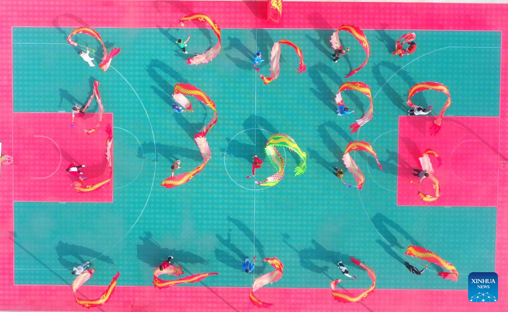 This aerial photo taken on Sept. 29, 2023 shows people performing dragon dance at Jiazhai Town of Liaocheng, east China's Shandong Province. Friday marks the traditional Mid-Autumn Festival this year in China, which is celebrated in diverse ways, ranging from family reunions with big feasts to public gatherings featuring traditional ceremonies, performances and Mid-Autumn gala. (Photo by Zhao Yuguo/Xinhua)