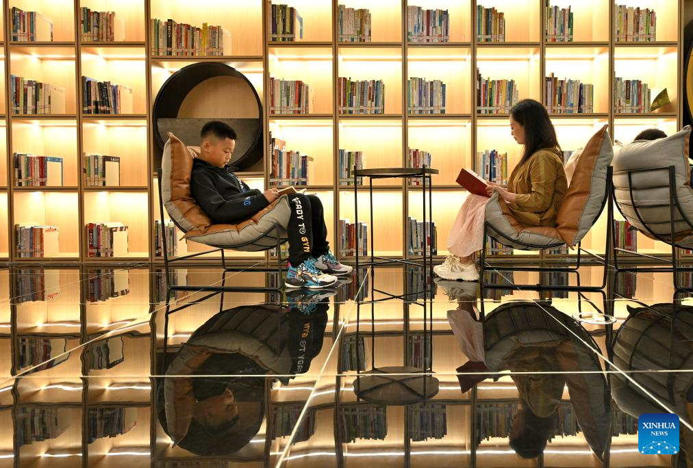 People read at a book bar on Xinglong Old Street in Xuan'en County, central China's Hubei Province, Sept. 29, 2023. Friday marks the traditional Mid-Autumn Festival this year in China, which is celebrated in diverse ways, ranging from family reunions with big feasts to public gatherings featuring traditional ceremonies, performances and Mid-Autumn gala. (Photo by Chen Xukai/Xinhua)