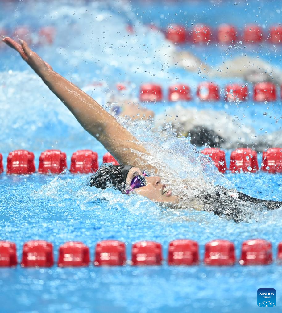 Kan Cheuk Tung Natalie of China's Hong Kong competes during the Women's 4x100m Medley Relay Final of Swimming at the 19th Asian Games in Hangzhou, east China's Zhejiang Province, Sept. 29, 2023. (Xinhua/Huang Zongzhi)