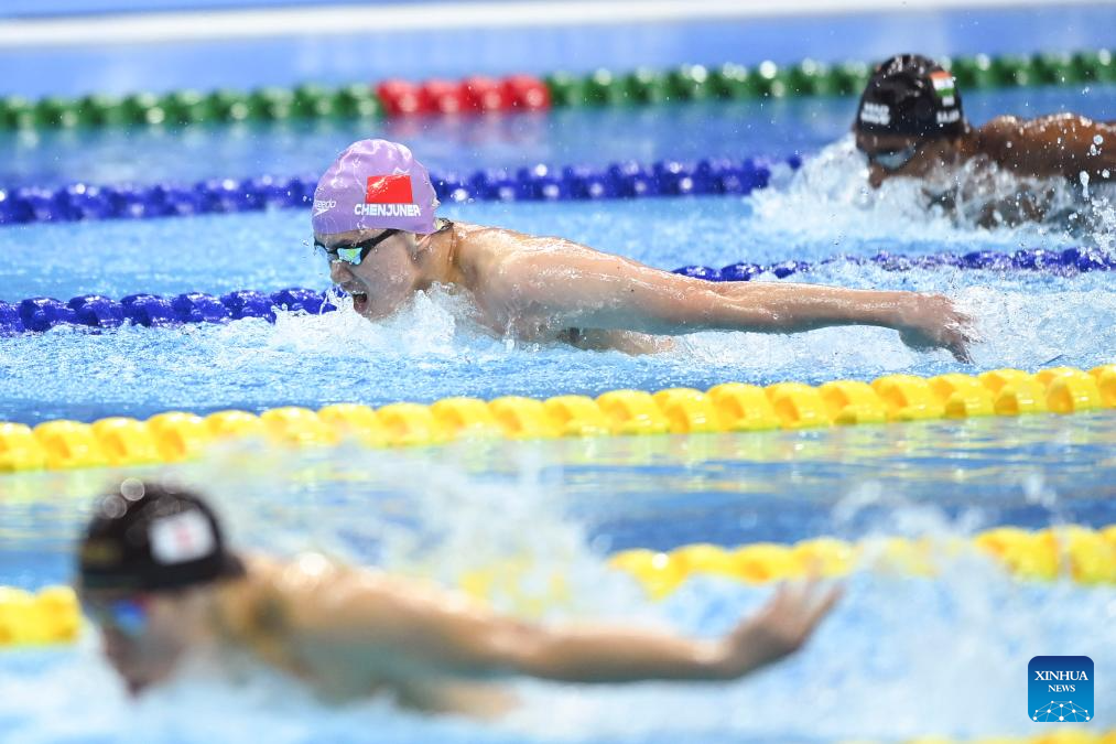 Chen Juner (C) of China competes during the Men's 200m Butterfly Final of Swimming at the 19th Asian Games in Hangzhou, east China's Zhejiang Province, Sept. 29, 2023. (Xinhua/Huang Zongzhi)