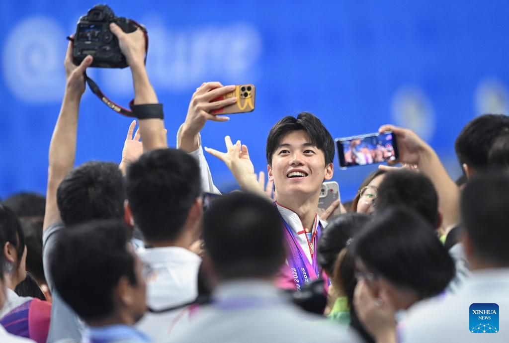 Wang Shun of China takes selfies with volunteers after Swimming contests at the 19th Asian Games in Hangzhou, east China's Zhejiang Province, Sept. 29, 2023. (Xinhua/Huang Zongzhi)