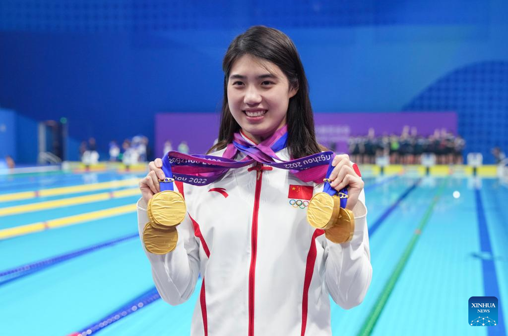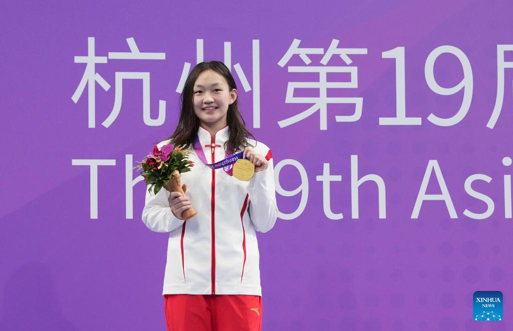 Gold Medalist Li Bingjie of China attends the awarding ceremony for Women's 800m Freestyle of Swimming at the 19th Asian Games in Hangzhou, east China's Zhejiang Province, Sept. 29, 2023. (Xinhua/Du yu)