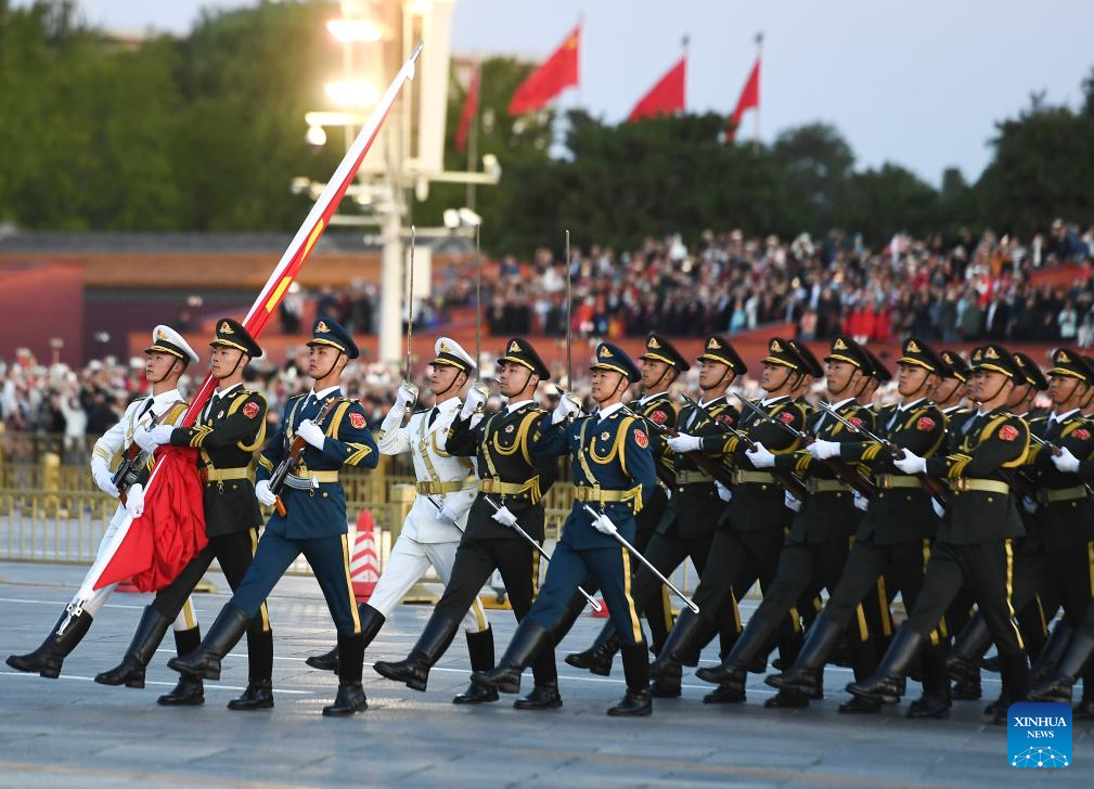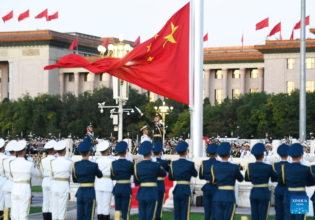 A flag-raising ceremony to celebrate the 74th anniversary of the founding of the People's Republic of China is held at the Tian'anmen Square in Beijing, capital of China, Oct. 1, 2023. (Xinhua/Ju Huanzong)