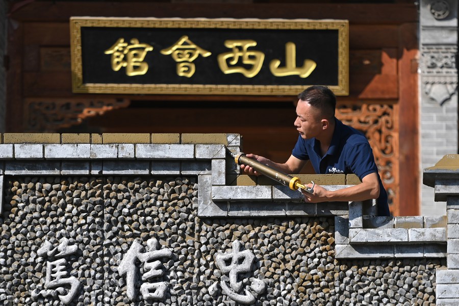 Villager Li Tan'en works at a theater in Qikou ancient town of Linxian County, north China's Shanxi Province, Aug. 2, 2023. In 2020, Li ended his career as a migrant worker and served as a staff member for a local theater in the Qikou ancient town. The job brings him an annual income of more than 50,000 yuan (about 6,848 U.S. dollars). (Photo by Liu Liangliang/Xinhua)