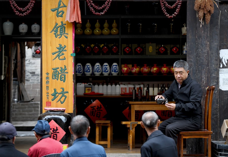 Zhang Hailong invites tourists to taste his vinegar products in the Qikou ancient town of Linxian County, north China's Shanxi Province, Sept. 26, 2023. Zhang once worked as a truck driver and opened a vinegar shop in the Qikou ancient town in 2018. (Photo by Liu Liangliang/Xinhua)