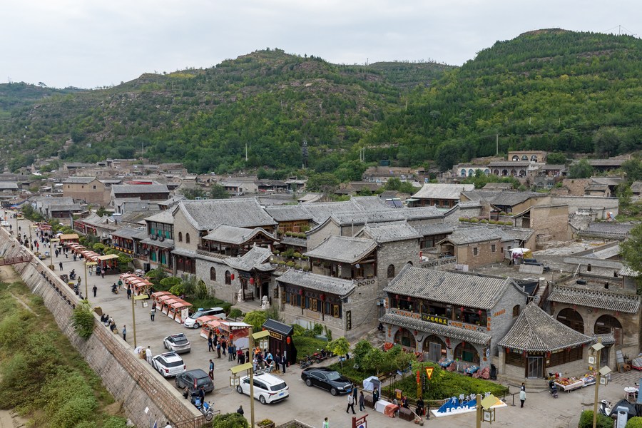 This aerial photo taken on Sept. 26, 2023 shows a view of the Qikou ancient town of Linxian County, north China's Shanxi Province. (Photo by Liu Liangliang/Xinhua)
