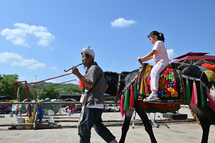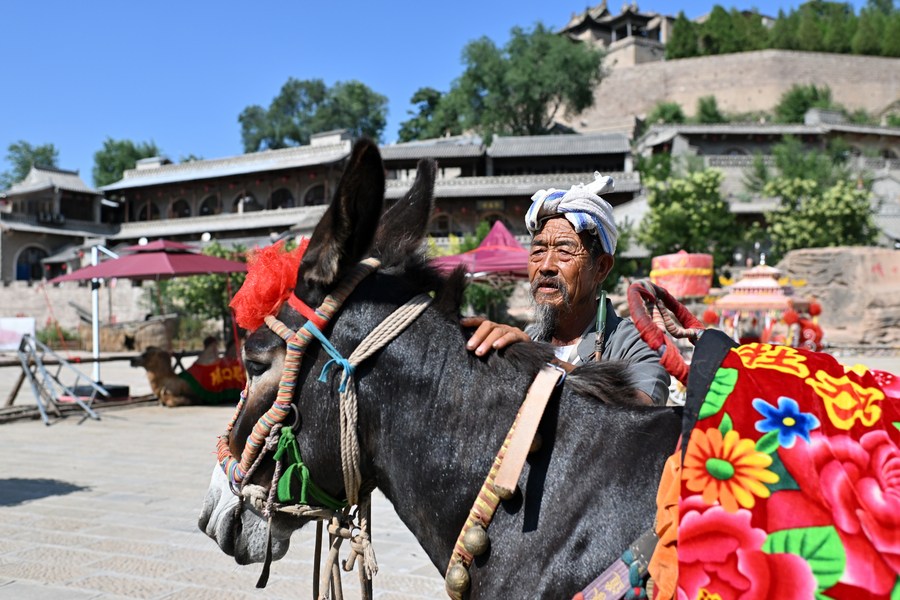 Villager Li Yonglin leads his donkey in the Qikou ancient town of Linxian County, north China's Shanxi Province, Aug. 2, 2023. Li would decorate his donkey and provide it to tourists for riding amid slack season of agricultural production. (Xinhua/Zhan Yan)