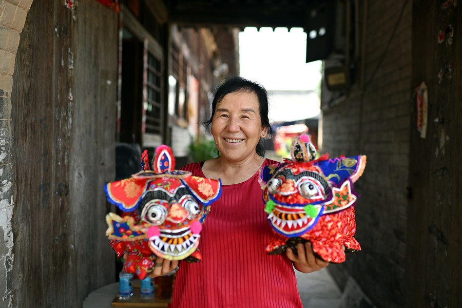 Villager Feng Yan'ai displays hand-sewn cloth tigers in the Qikou ancient town of Linxian County, north China's Shanxi Province, Aug. 2, 2023. Cloth tigers and shoes made by Feng have gained great popularity among tourists and earn her more than 30,000 yuan (about 4108 U.S. dollars) per year. (Xinhua/Zhan Yan)