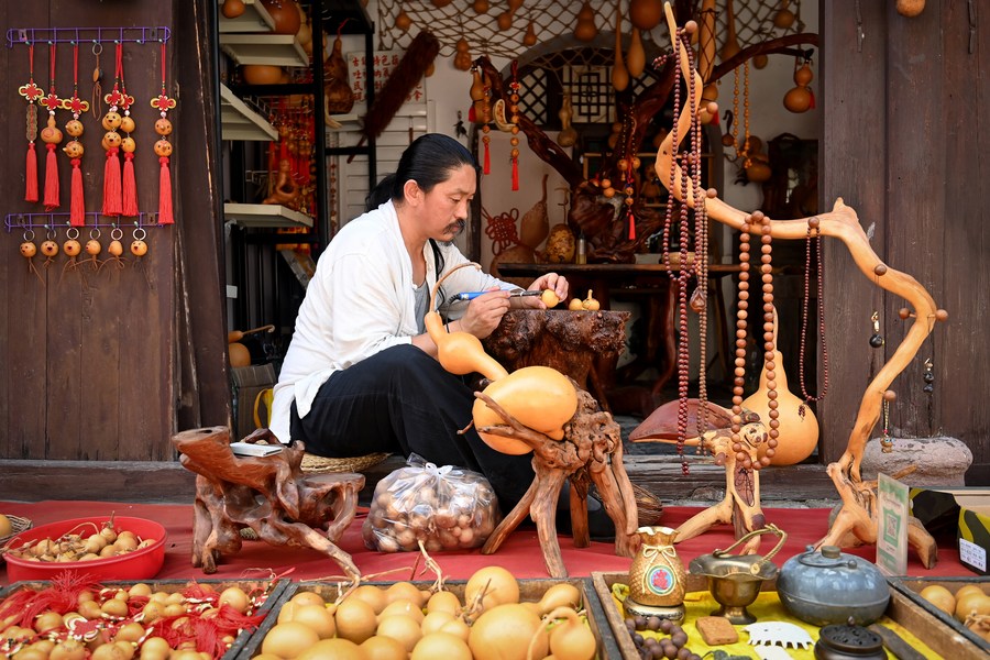 Yan Qiangqiang makes gourd crafts in the Qikou ancient town of Linxian County, north China's Shanxi Province, Aug. 2, 2023. (Photo by Liu Liangliang/Xinhua)