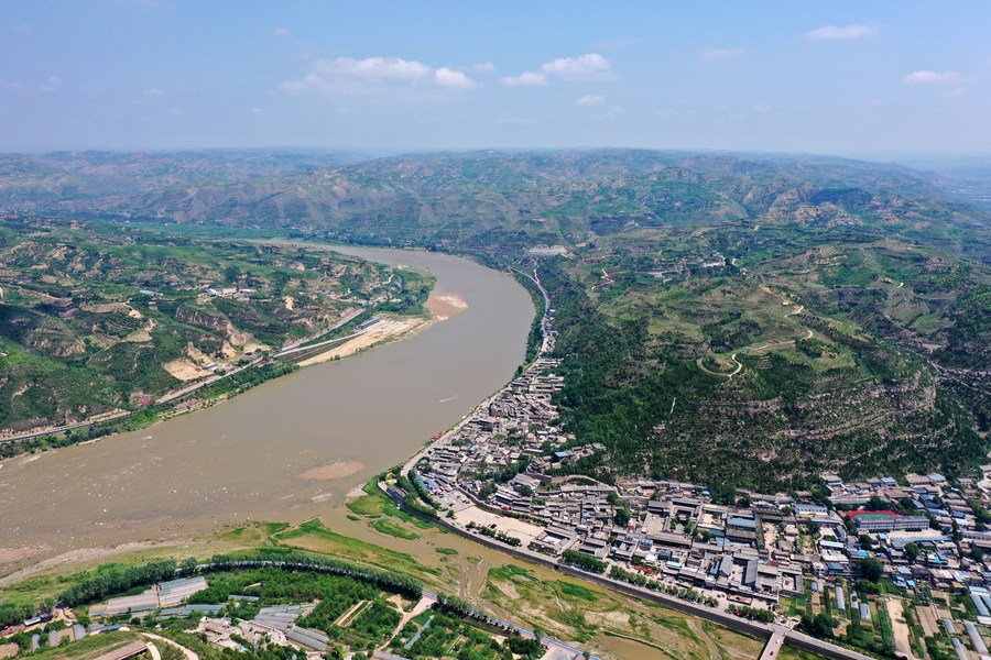This aerial photo taken on Aug. 2, 2023 shows a view of the Qikou ancient town of Linxian County, north China's Shanxi Province. (Xinhua/Zhan Yan)