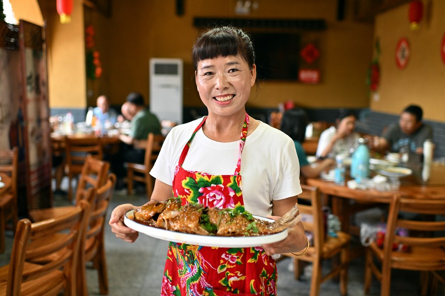 Villager Jia Juan presents a dish of her own restaurant in the Qikou ancient town of Linxian County, north China's Shanxi Province, Aug. 2, 2023. Jia once worked as a tour guide in the Qikou ancient town and started to run a restaurant in 2011. (Xinhua/Zhan Yan)