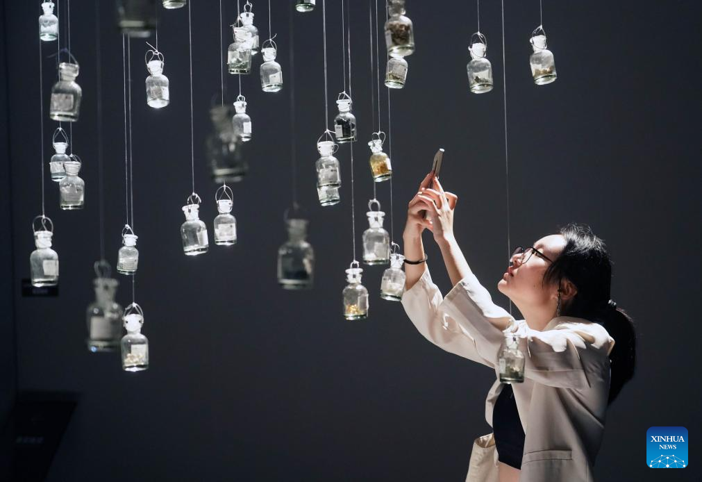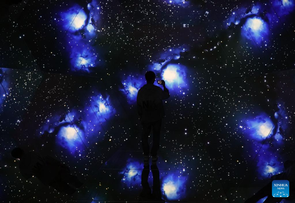 A visitor takes pictures at a science and art exhibition at the Beijing Times Art Museum in Beijing, capital of China, Oct. 2, 2023. People across the country participate in cultural activities to enrich their holiday life during the National Day holiday. (Xinhua/Ren Chao)