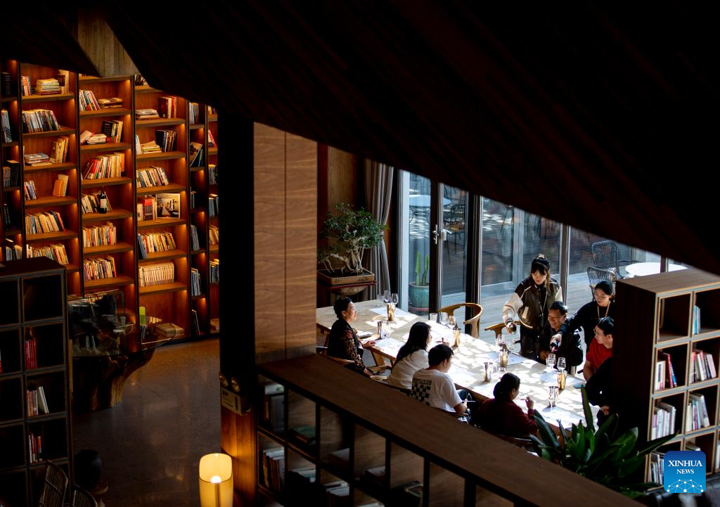 People enjoy wine at a chateau in Qingtongxia City, northwest China's Ningxia Hui Autonomous Region, Oct. 2, 2023. People across the country participate in cultural activities to enrich their holiday life during the National Day holiday. (Xinhua/Yang Zhisen)