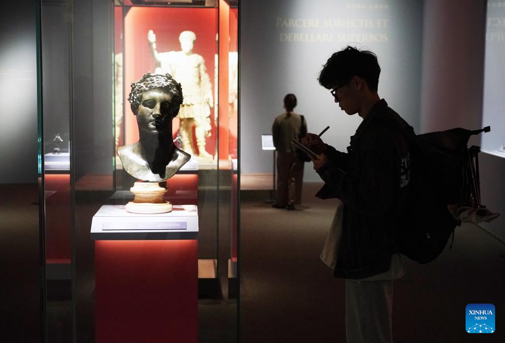 People visit an exhibition on ancient Roman civilization at the China Millennium Monument in Beijing, capital of China, Oct. 2, 2023. People across the country participate in cultural activities to enrich their holiday life during the National Day holiday. (Xinhua/Ren Chao)