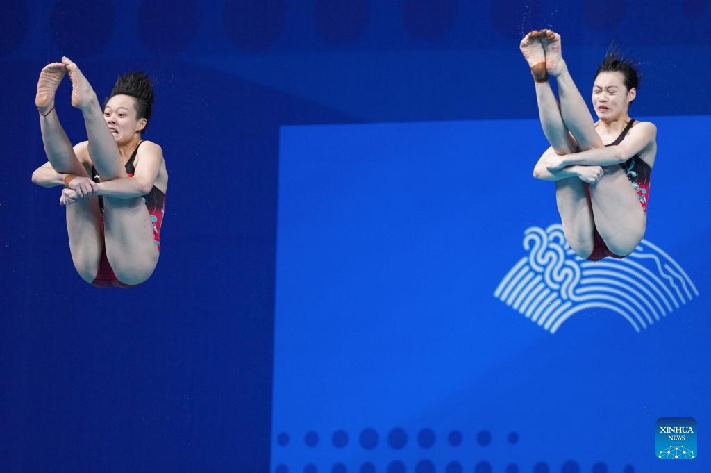 Chen Yiwen (L)/Chang Yani of China compete during the Women's Synchronised 3m Springboard Final of Diving at the 19th Asian Games in Hangzhou, east China's Zhejiang Province, Oct. 1, 2023. (Xinhua/Du yu)