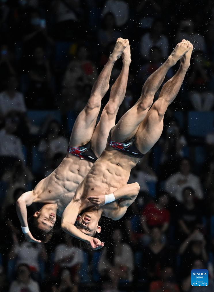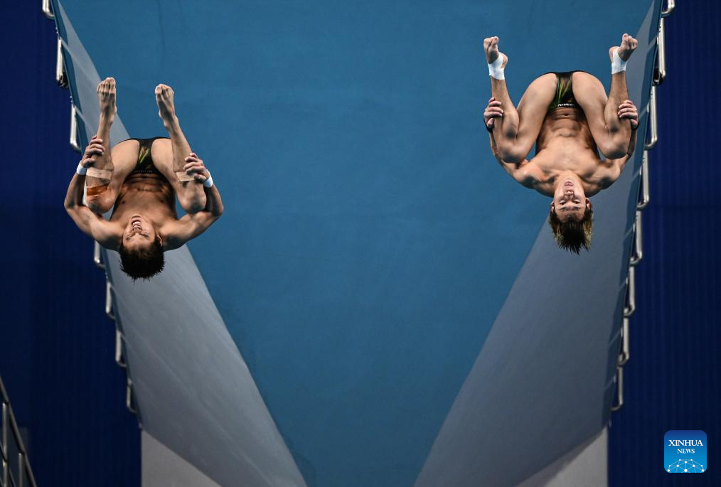 Yang Hao (L)/Lian Junjie of China compete during the Men's Synchronised 10m Platform Final of Diving at the 19th Asian Games in Hangzhou, east China's Zhejiang Province,Oct. 1, 2023. (Xinhua/Xia Yifang)