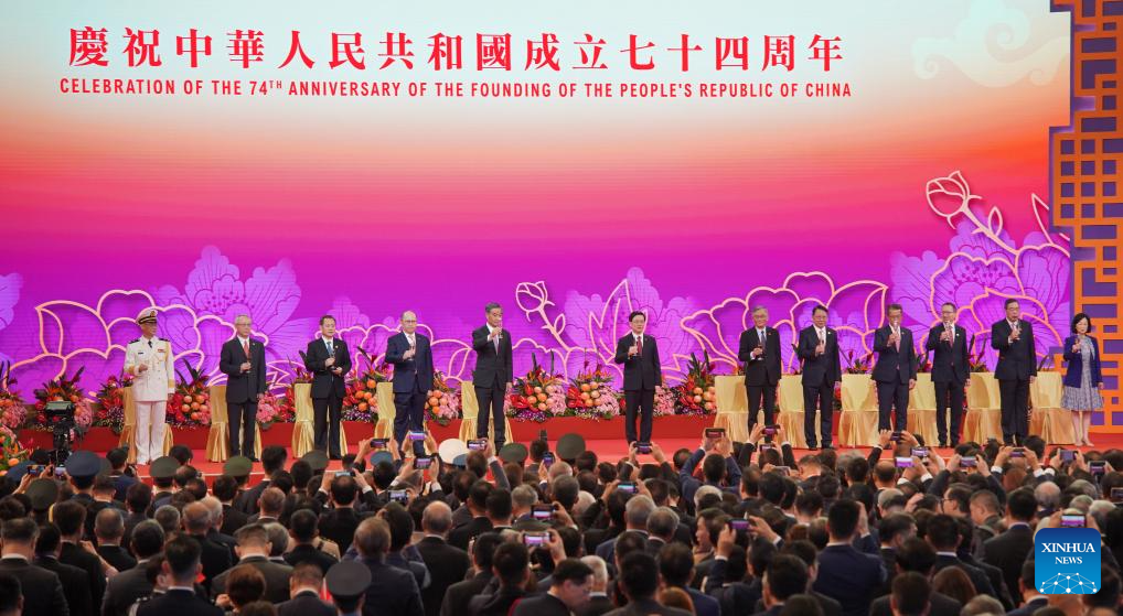 HONG KONG, Oct. 1 (Xinhua) -- The Hong Kong Special Administrative Region (HKSAR) government held a flag-raising ceremony and a reception Sunday to celebrate the 74th anniversary of the founding of the People's Republic of China.
