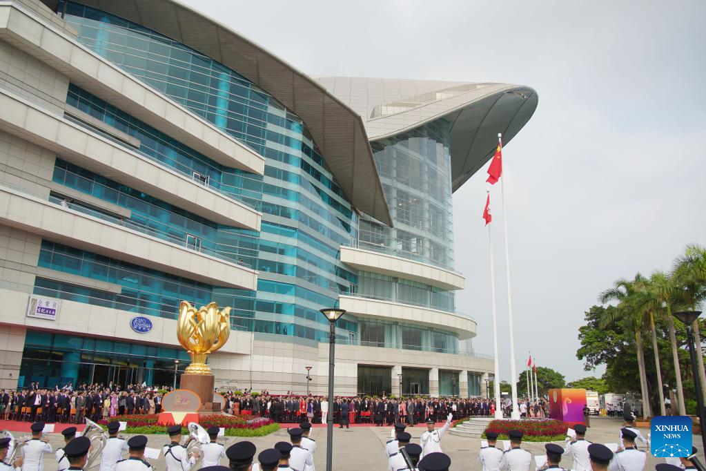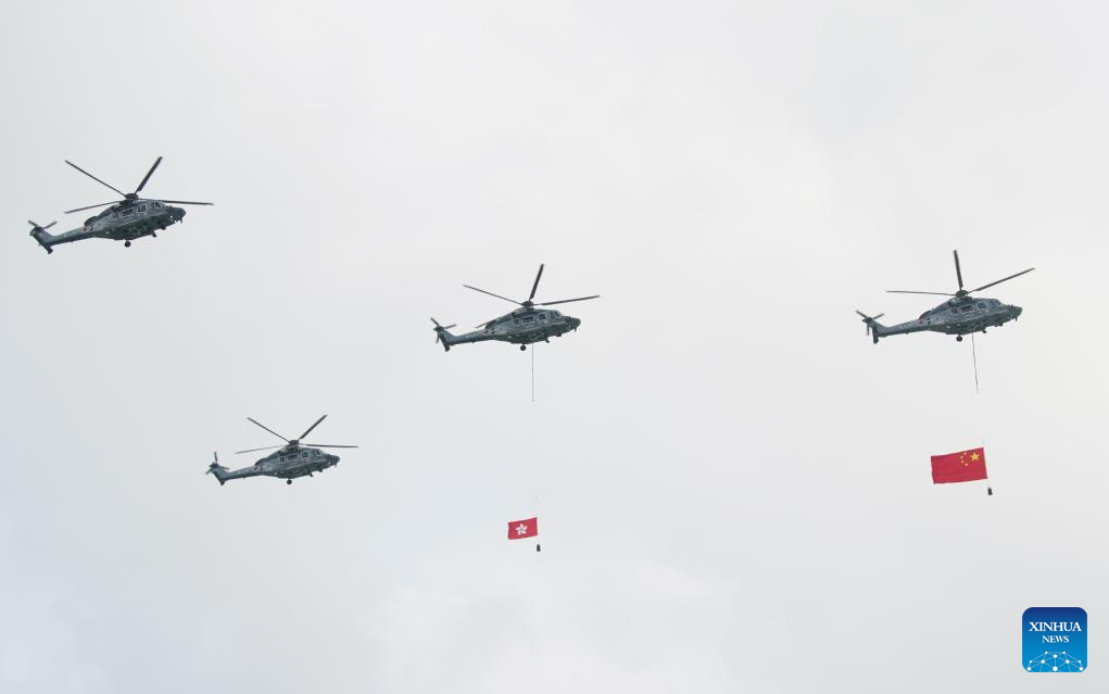 China's national flag and the HKSAR flag were hoisted, and the national anthem was played at the Golden Bauhinia Square in Hong Kong on Sunday morning. Helicopters carrying the national and HKSAR flags flew over Victoria Harbor in celebration.