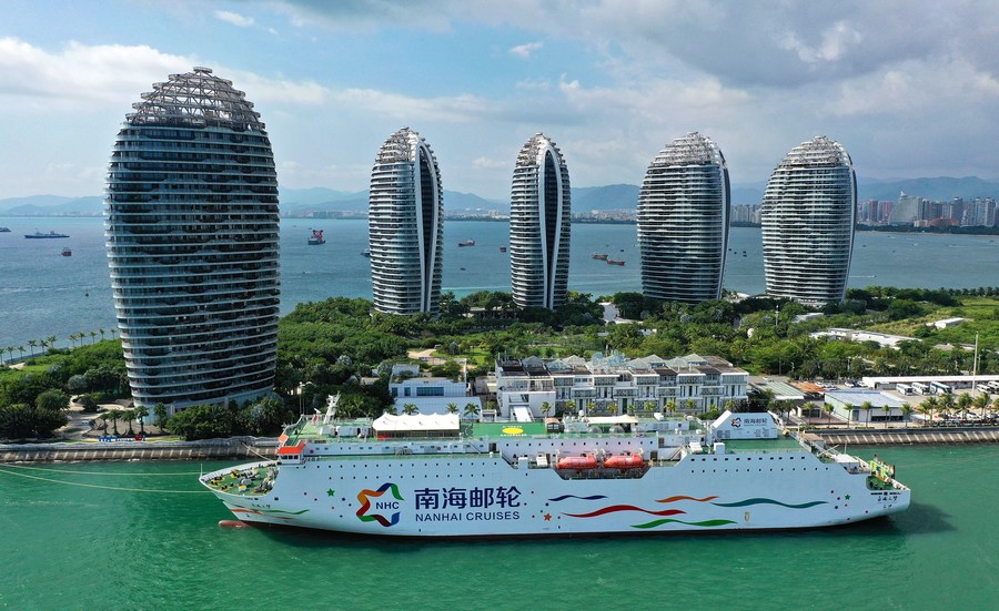 This aerial photo taken on Oct. 1, 2023 shows a cruise ship harboring at a port in Sanya, south China's Hainan Province. (Xinhua/Guo Cheng)