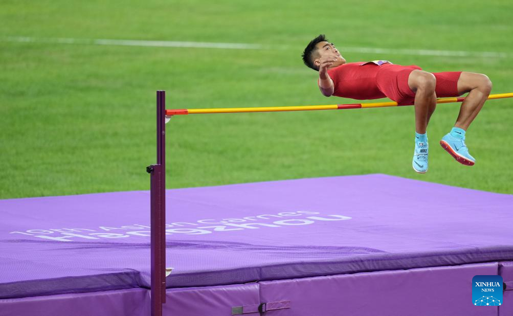 Sun Qihao of China competes during the Men's Decathlon High Jump of Athletics at the 19th Asian Games in Hangzhou, east China's Zhejiang Province, Oct. 2, 2023. (Xinhua/Sun Fei)
