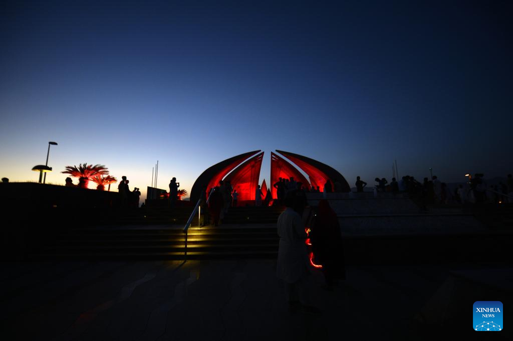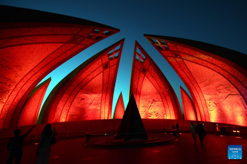People visit the National Monument illuminated in red color to celebrate the 74th anniversary of the founding of the People's Republic of China, in Islamabad, capital of Pakistan on Oct. 1, 2023. (Xinhua/Ahmad Kamal)