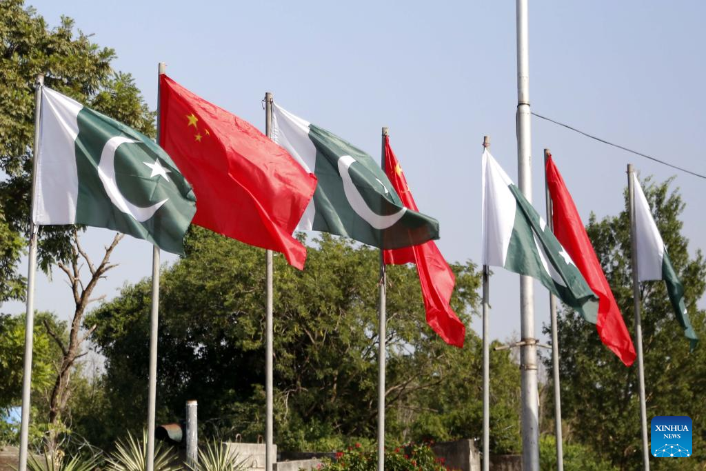 Chinese national flags and Pakistani national flags are raised to celebrate the 74th anniversary of the founding of the People's Republic of China, by an avenue in Islamabad, capital of Pakistan, on Oct. 1, 2023. (Xinhua/Ahmad Kamal)