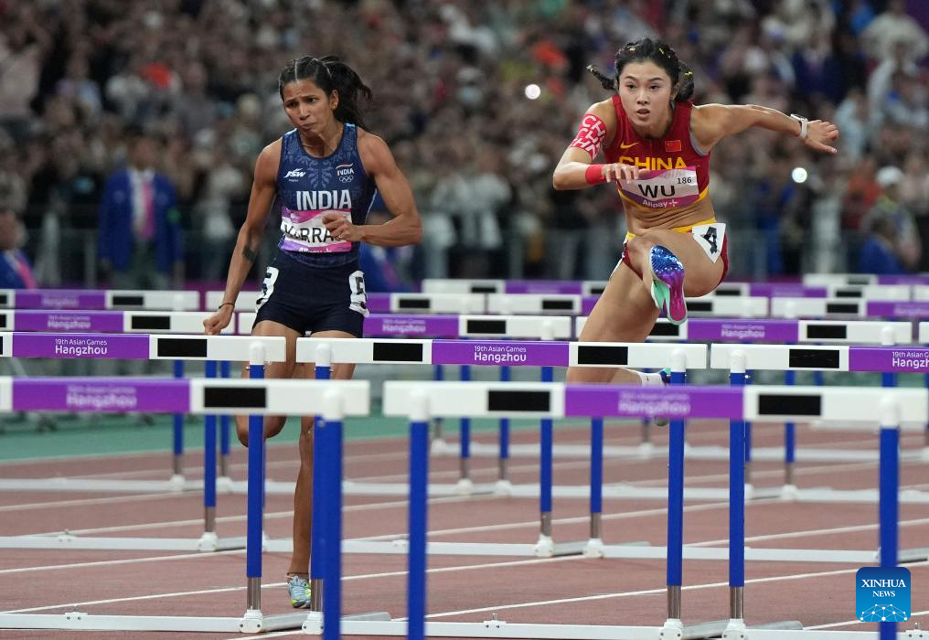 Wu Yanni (R) of China competes during the Women's 100m Hurdles Final of Athletics at the 19th Asian Games in Hangzhou, east China's Zhejiang Province, Oct. 1, 2023. (Xinhua/Li Yibo)