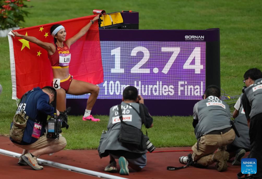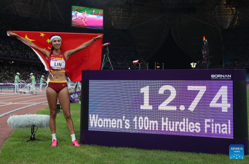 Lin Yuwei of China celebrates after the Women's 100m Hurdles Final of Athletics at the 19th Asian Games in Hangzhou, east China's Zhejiang Province, Oct. 1, 2023. (Xinhua/Li Yibo)