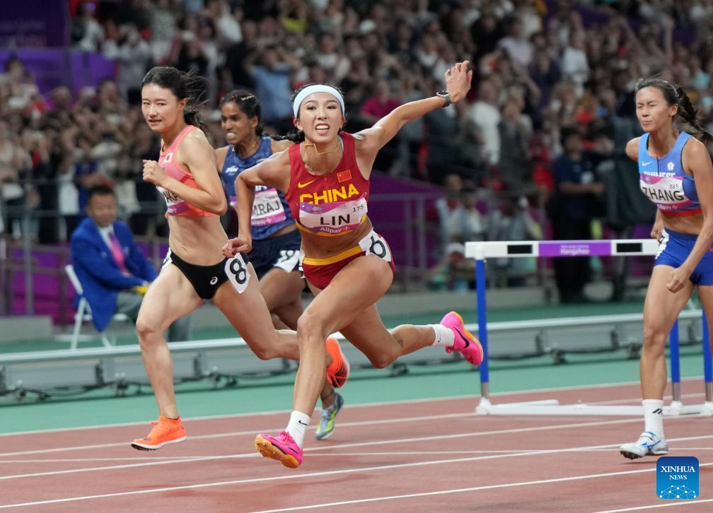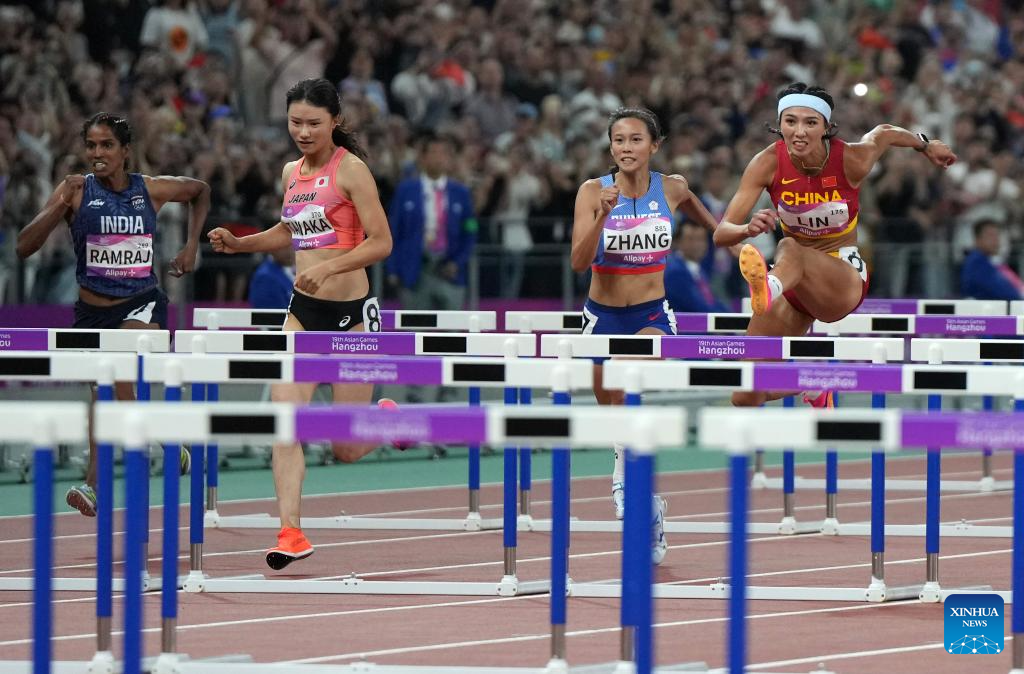 Lin Yuwei (2nd R) of China competes during the Women's 100m Hurdles Final of Athletics at the 19th Asian Games in Hangzhou, east China's Zhejiang Province, Oct. 1, 2023. (Xinhua/Li Yibo)