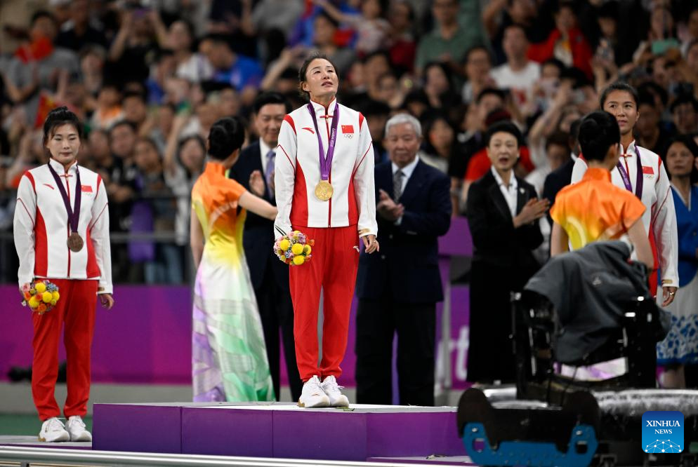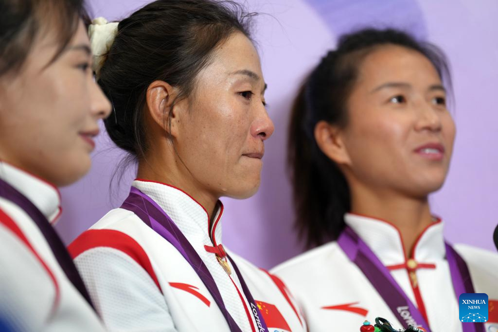 Gold medalist Qieyang Shijie (C) for the Women's 20km Race Walk at the 2012 London Olympic Games reacts during the Olympic Medal Reallocation Ceremony in Hangzhou, east China's Zhejiang Province, Oct. 4, 2023. (Xinhua/Song Yanhua)